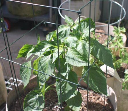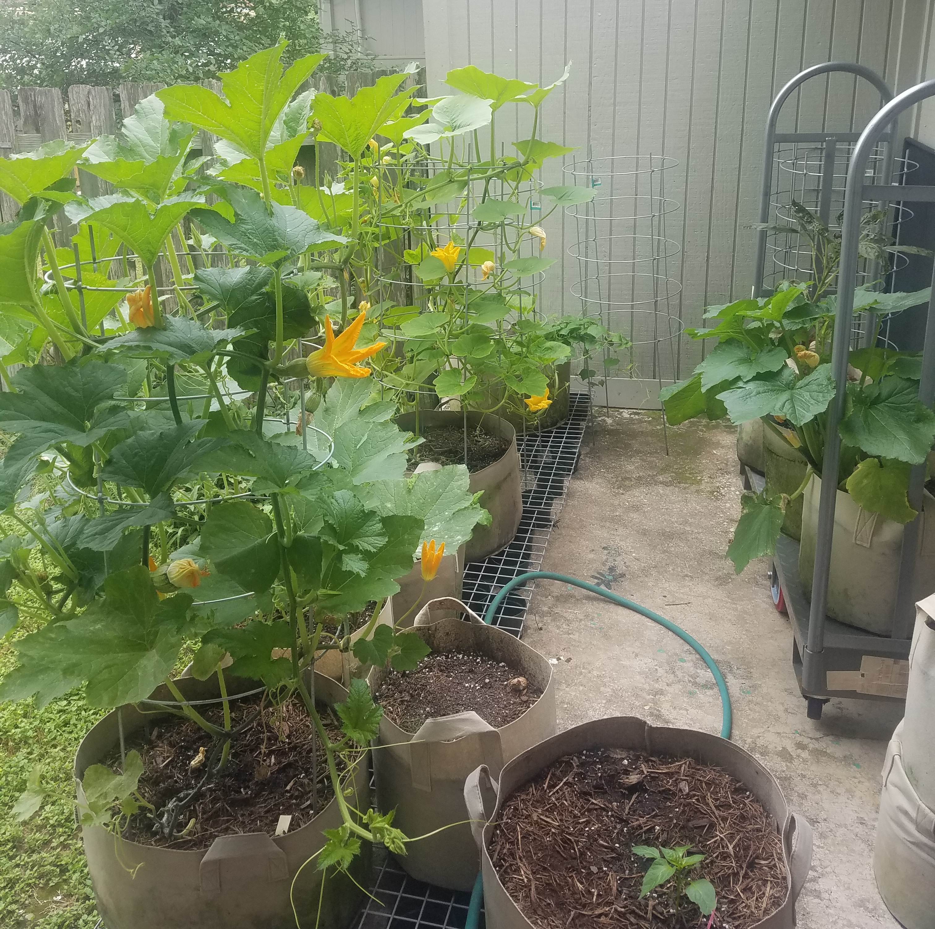 The trellis-cage-things had spiky bits which I rounded off with some moldable plastic, so they wouldn't poke through the fabric bags. Even the big 20 gallon bags ended up a bit small for the squash and pumpkin plants, which had trouble getting enough water and didn't produce much.
