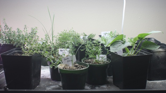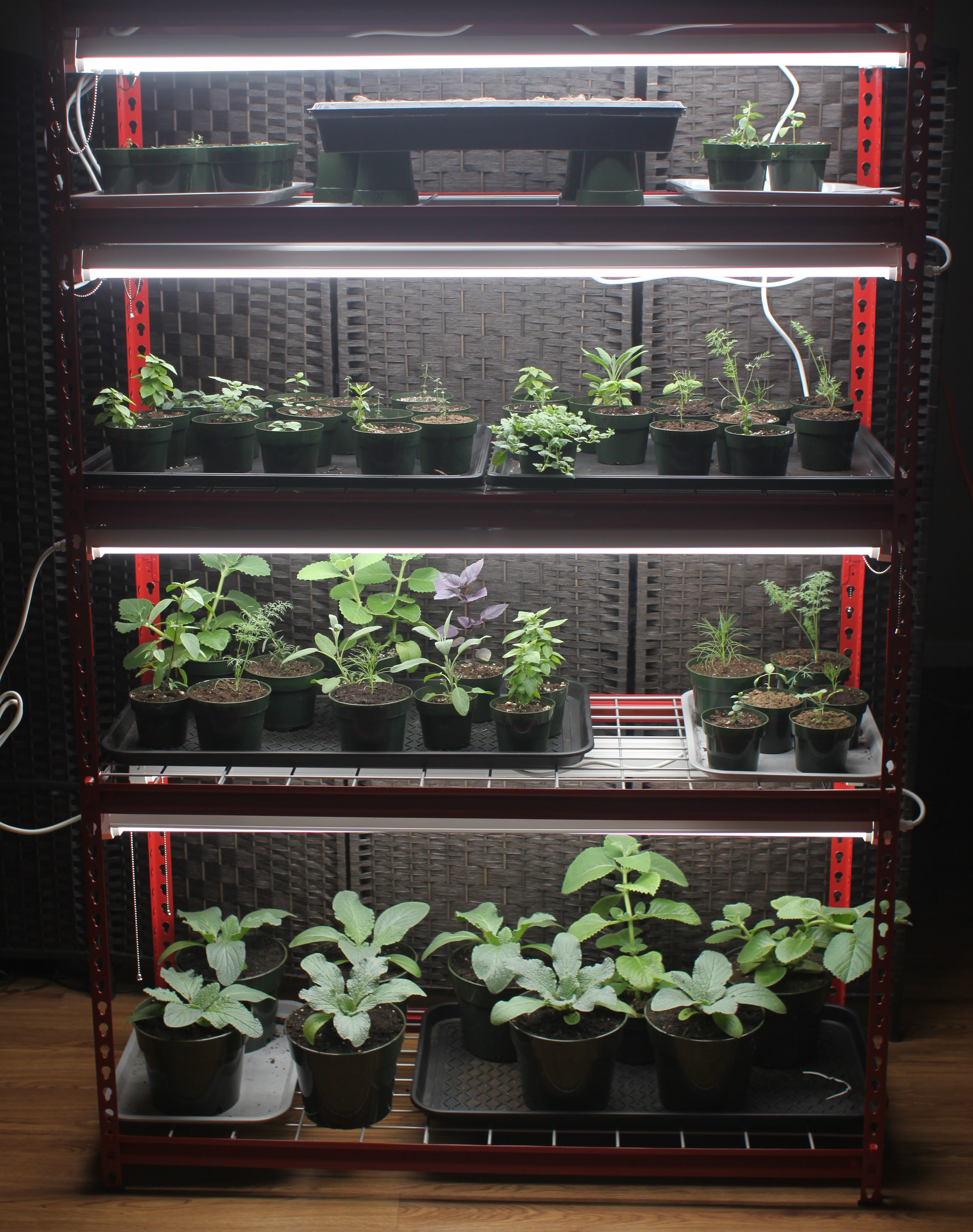 I got into gardening over the winter, so I started indoors. Rather than deal with lots of little shelves and lights, I went a bit industrial with some metal racks and LED shop lights, so I could fit in more plants with good light.